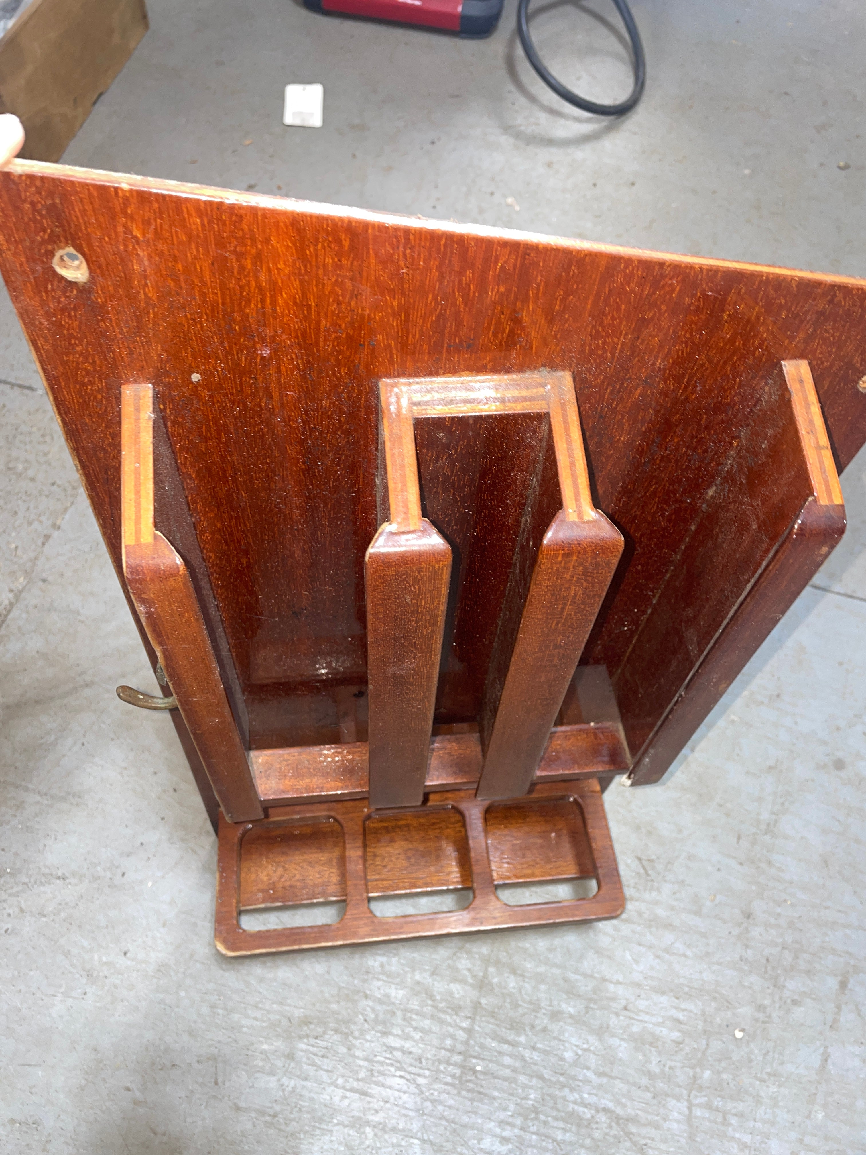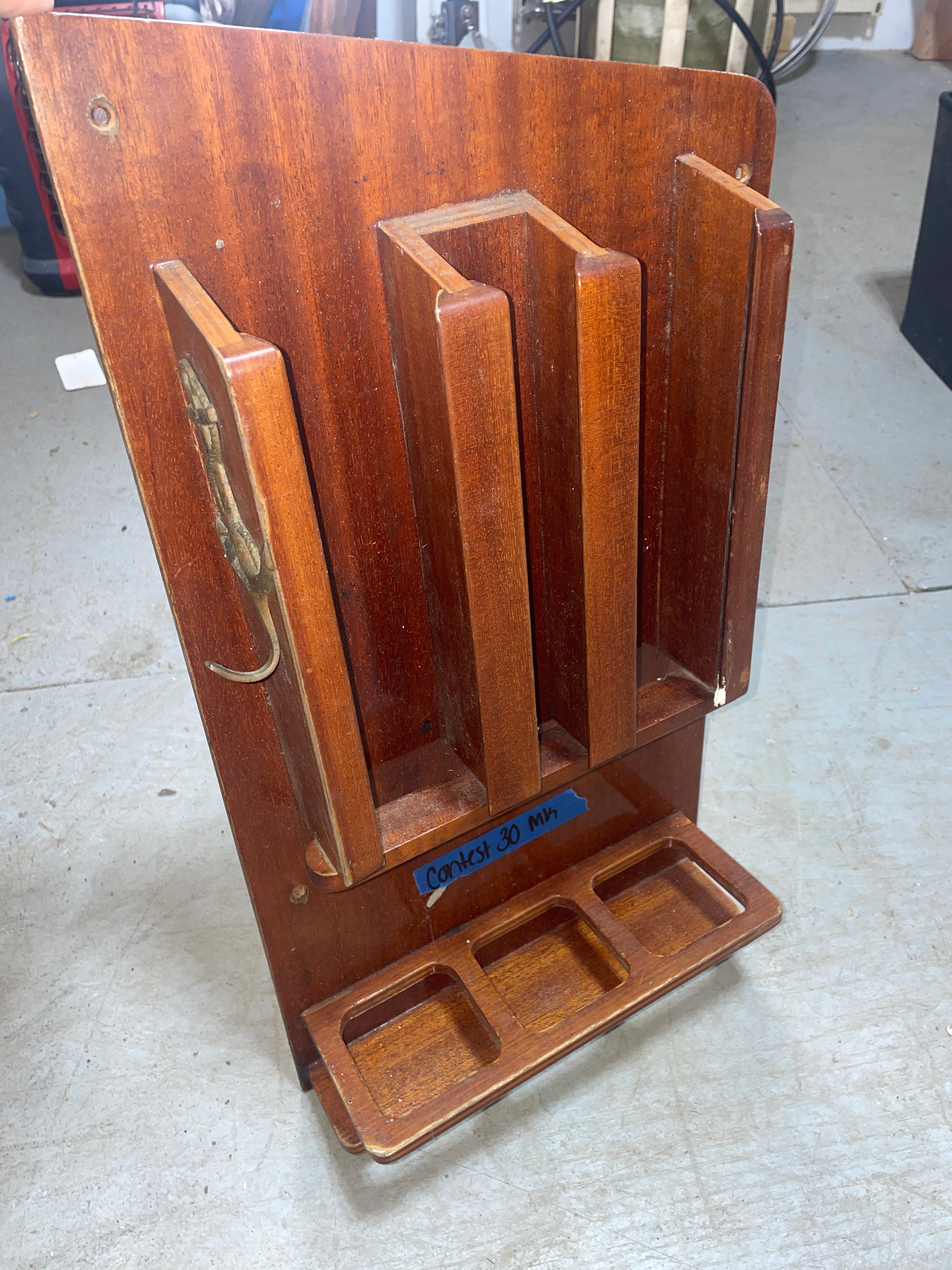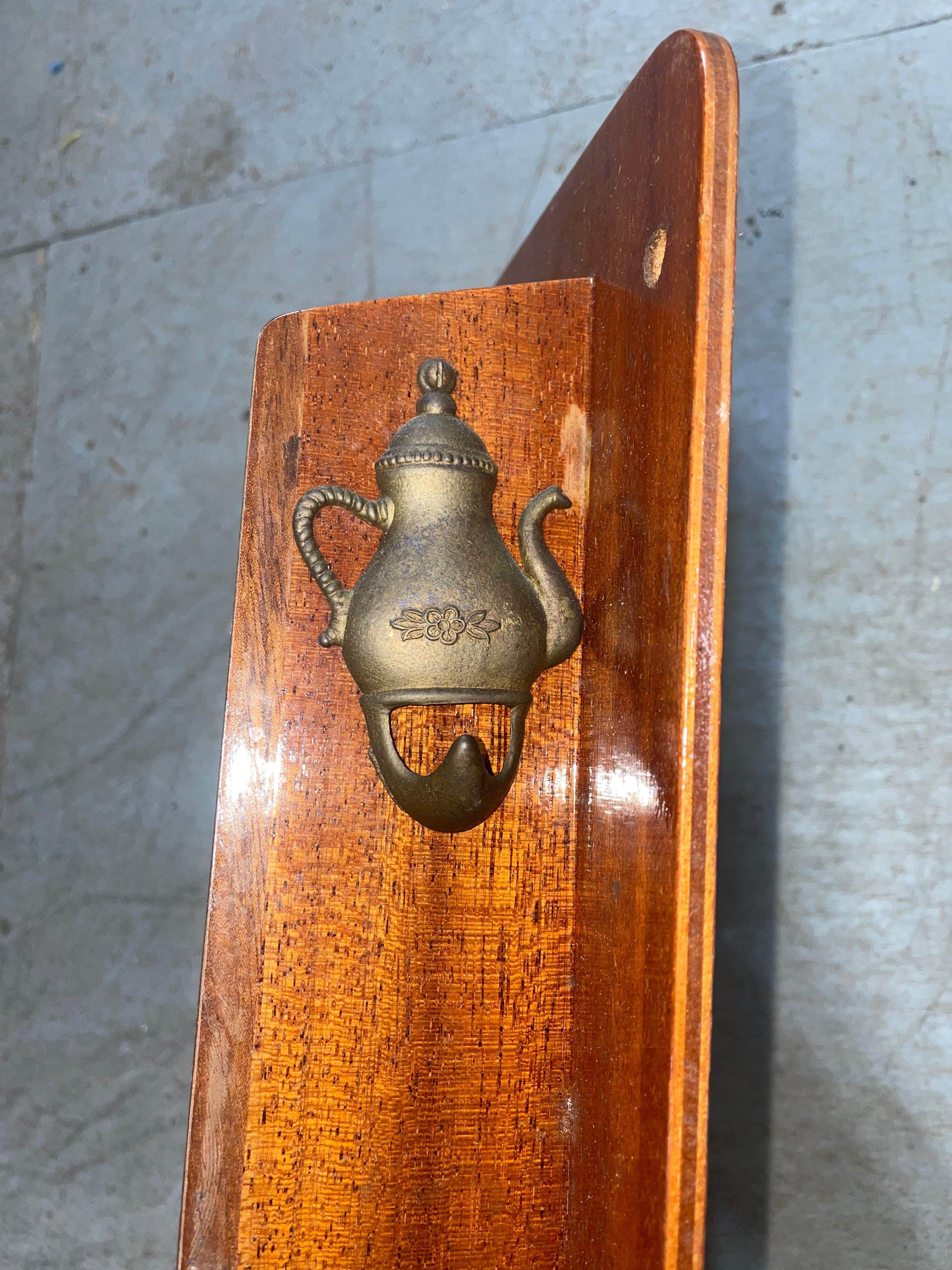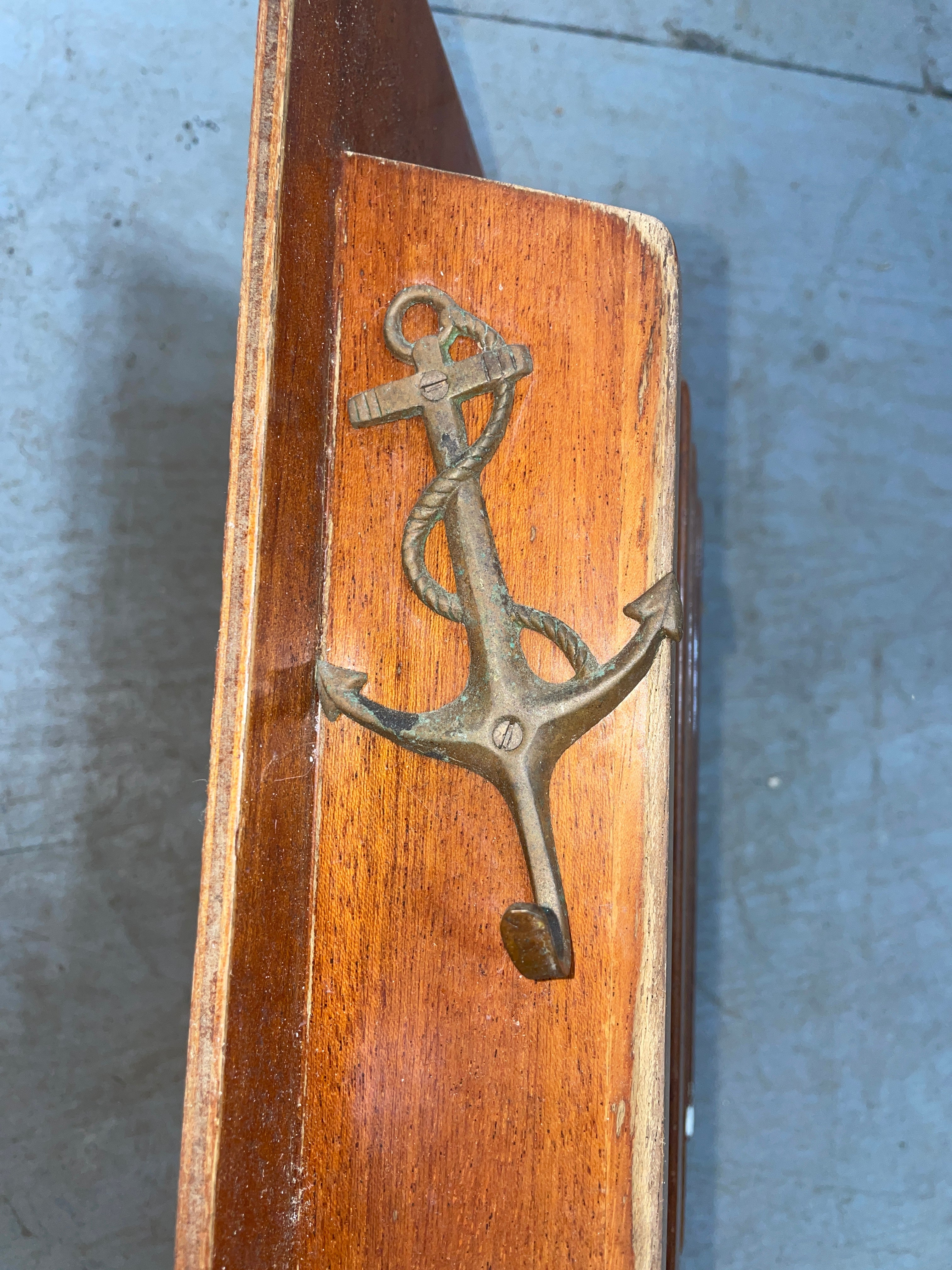 This wooden galley dish-ware holder and/or organizer is in great condition. It was removed off a Contest 30 MKII. Has the 2 vertical slots of cups. These slotted areas are 3” wide x 2” deep x 10” long. There is a small shelf at the base with 3 more 2 7/8” x 2 7/8” squares. Included with this on one side is an adorable brass anchor hoo. On the other side there is a brass teapot hook. The backing mount to this a trapezoid shape so the long sides are 19 3/4” long and 22” long. The shorter sides are 12 3/4” x 12”.