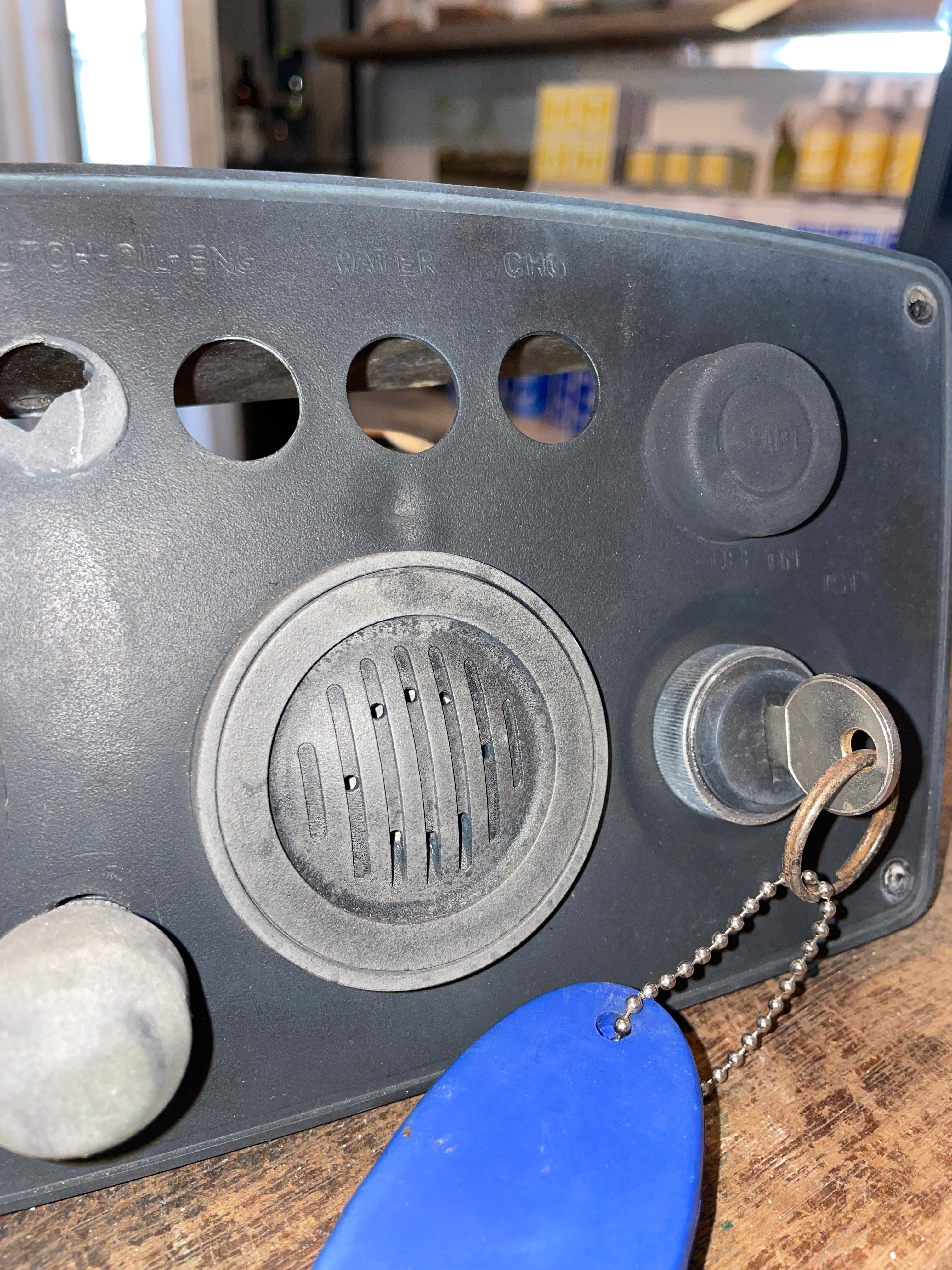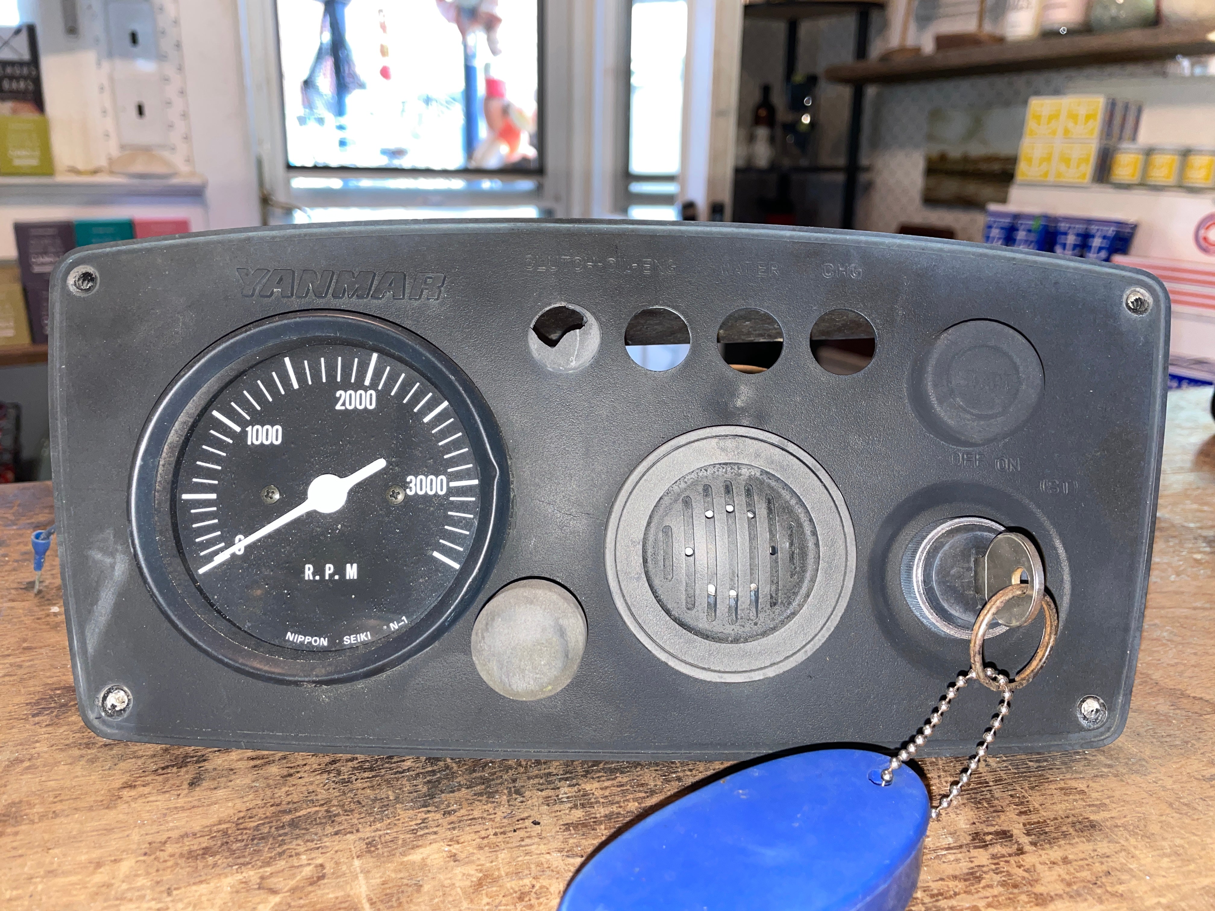 This yanmar engine panel is in overall great condition. Very clean. The RPM gauge does have a little dent (jut cosmetic). Will need the one part beside where the lights go needs to be replaced. Comes with key. All imperfections have been circled so please look at the photos. Does not have any wiring.